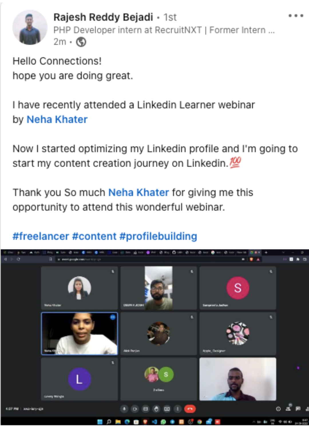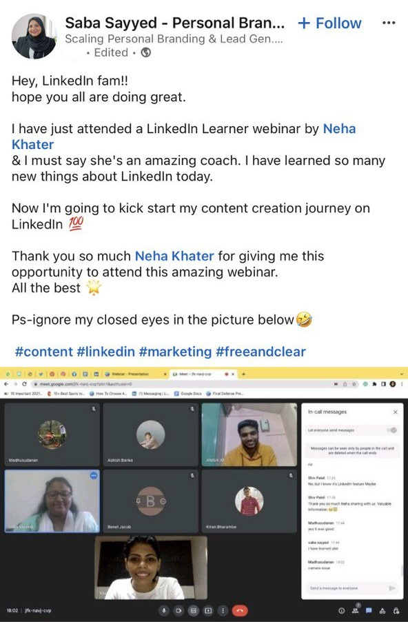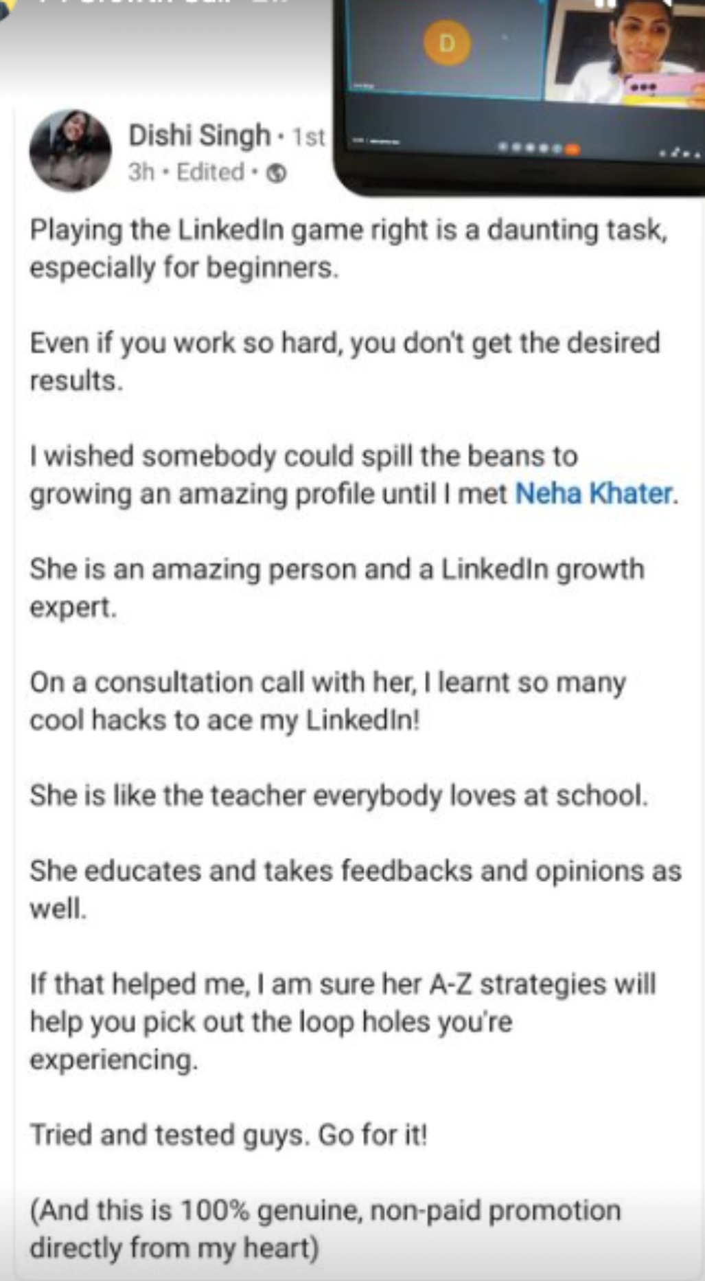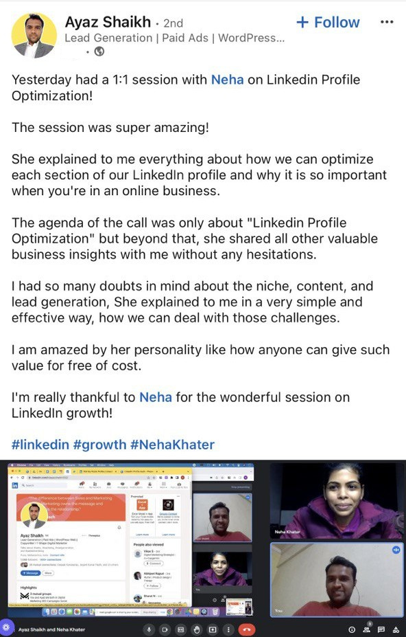 Hi, I’m Neha Khater, a Homemaker, LinkedIn Coach & Personal Branding Strategist. I started my career as a Digital Marketer in 2020. During my training, I received the “Award of Excellence” from DDIP. Even after that, I was struggling to get an Internship.